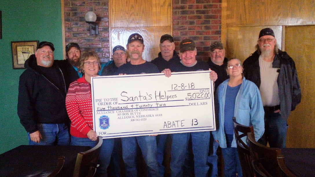 Members of ABATE District 13 of Nebraska held their Annual Toy Run and Chilli Feed in late November with the proceeds going to the Santa’s Helpers program of Alliance. Last week ABATE presented a check for $5022.00 to go towards the purchase of toys for the annual Santa’s Helpers Christmas Party. The party will be held Sunday, December 16, 6 pm, at the Alliance Eagles Club. Pictured are members of ABATE District 13 of Nebraska and Santa’s Helpers Co-Chairperson Julie Johnson.