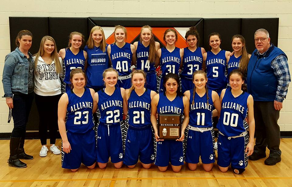 For the second straight season, the Alliance Girls Basketball Team finishes as the B-6 District runner-up. The Lady Bulldogs fall to Sidney 54-33 in the Championship Game, Saturday in Ogallala. Sidney built an early lead behind the hot shooting of Janay Brauer, who hit 3-3 pointers in the opening quarter to spark the Lady Raiders to a 15-10 lead. Sidney held the 5 point advantage at halftime 23-18, but go off to a quick start in the 3rd quarter behind Meghan Ross who scored 7 points as the Lady Raiders outscored Alliance 17-11 and extended the lead to 40-29 heading into the 4th quarter. Sidney put the game away with a 14-4 run in the final quarter to take the 54-33 win. Sidney advances to the Girls State Tournament with a 20-5 record. Alliance finishes the season at 13-11 Sidney will be the #5 seed at the State Tournament and will face #4 seed Norris (17-6) in the opening round, Thursday March 2, 8:45 pm (CT) at the Devaney Sports Center.