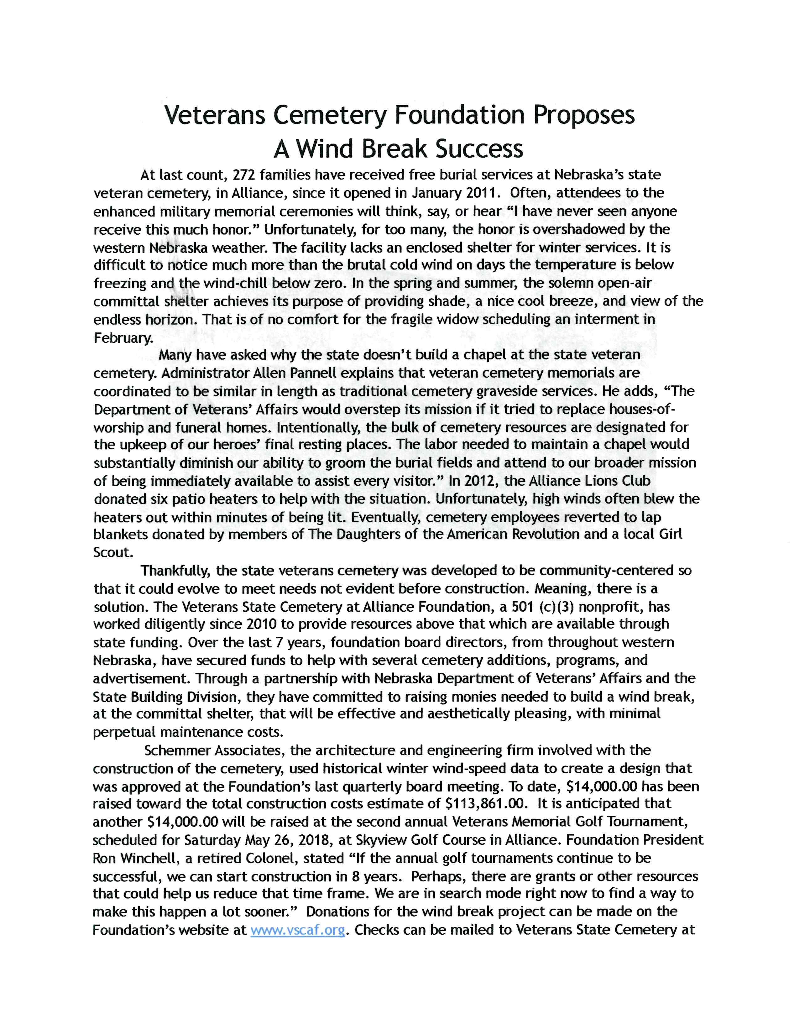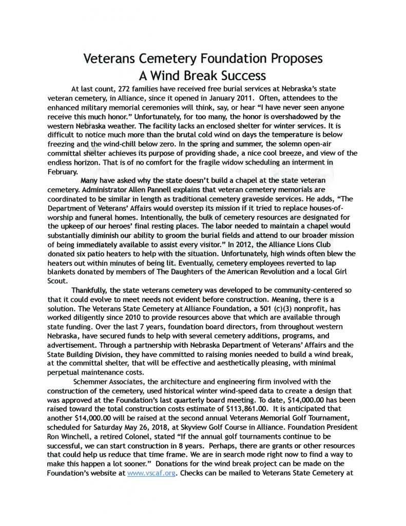 Alliance Veterans Cemetery Foundation Proposes “A Wind Break Success” Posted on March 7, 2018March 7, 2018