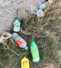 just south of the hotel, where it appeared that several attempts were made to manufacture methamphetamine buy using a “shake and bake” method in a pop bottle. “It appears that they were missing one or two key ingredients for the process to be successful, but they did make four or five attempts. If you happened to come across items like this, (pictured below) please contact your local law enforcement agency as soon as possible. The liquid and containers can be dangerous,” say Lieutenant Rick Hickstein.