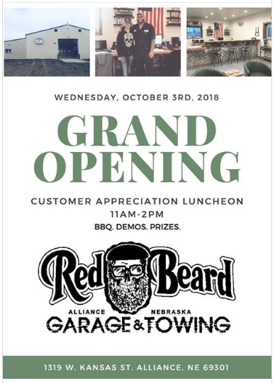 Red Beard Garage and Towing started in 2014, and has recently moved to a new location on West Kansas Street in Alliance. They’ll be having an open house on October 3rd with BBQ, Demos, Prizes, and KCOW will be broadcasting live from 11am to 1pm. We spoke with Elizabeth Fritzler about everything that’s going on, you can listen to that interview below.