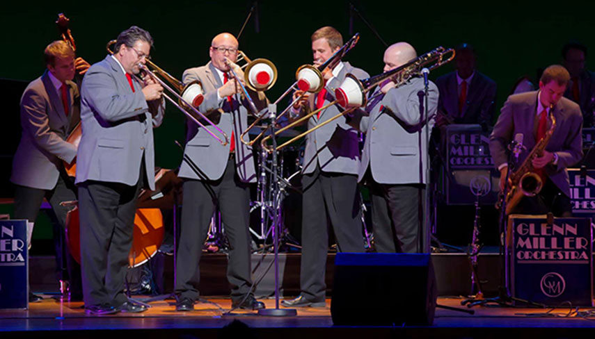 The Glenn Miller Orchestra consists of music director and vocalist Nick Hilscher, five saxophone players, four trumpeters, four trombonists, and three rhythm musicians who play the piano, bass and drums.