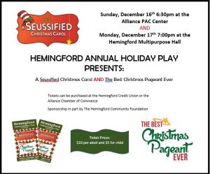 Hemingford will present their Annual Holiday Play. “A Seussified Christmas Carol” and “The Best Christmas Pageant Ever” Sunday,  December 16th, 6:30 pm, at the Alliance High School Performing Arts Center and again Monday, December 17th, 7 pm, at the Hemingford Multipurpose Hall.  Tickets are $10 for adults and $5 for children and may be purchased at the Hemingford Credit Union or the Alliance Chamber of Commerce.
