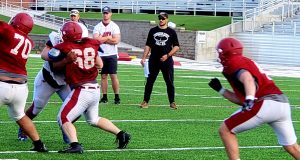 Coach Sasse will also work with the Eagle linebackers and oversees O-vs-D drills on his first day of practice last week.