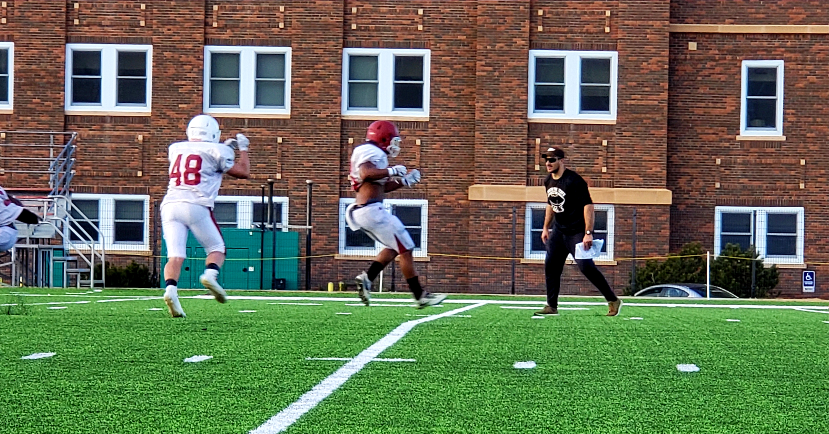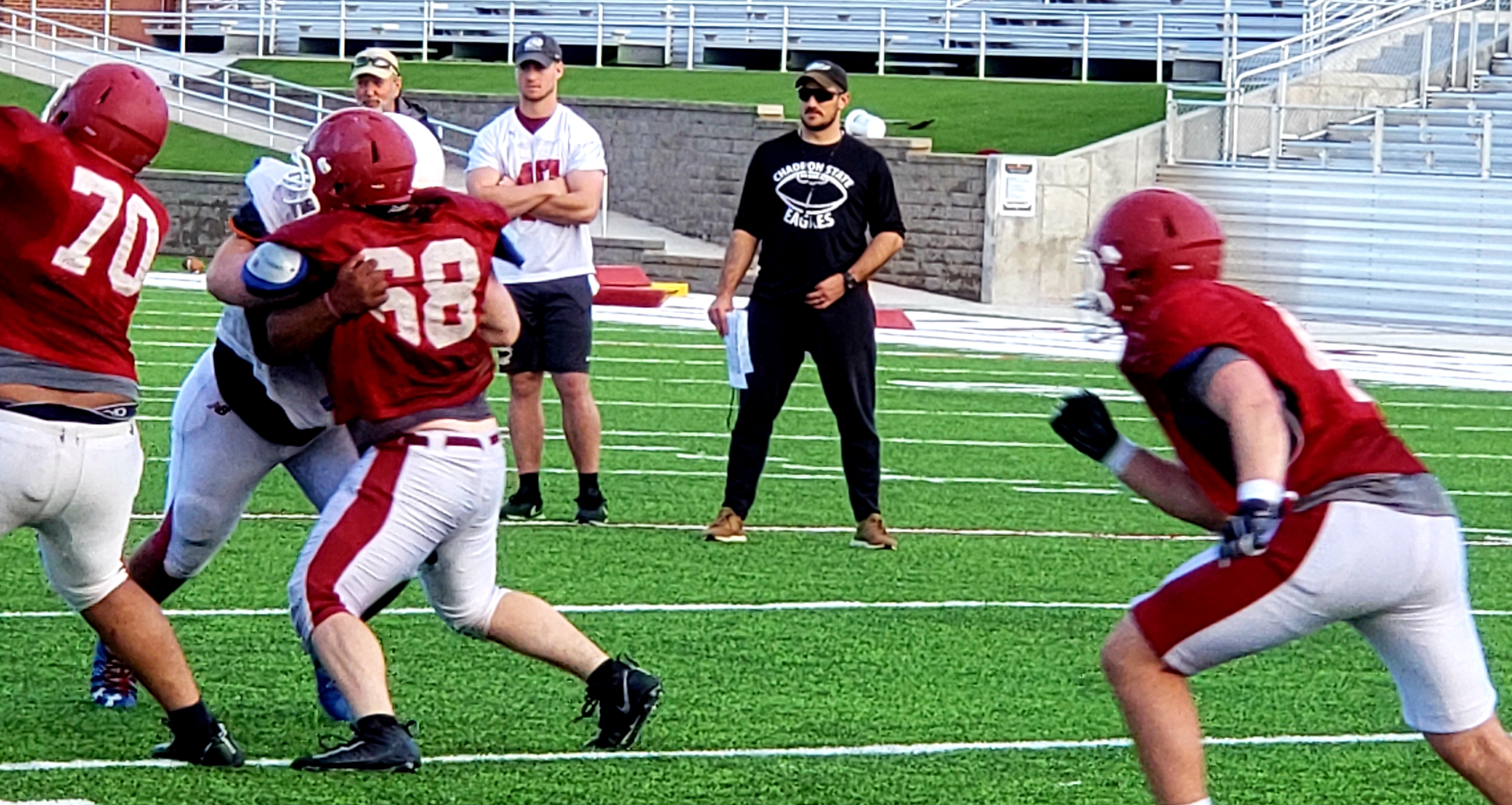 Coach Sasse will also work with the Eagle linebackers and oversees O-vs-D drills on his first day of practice last week.